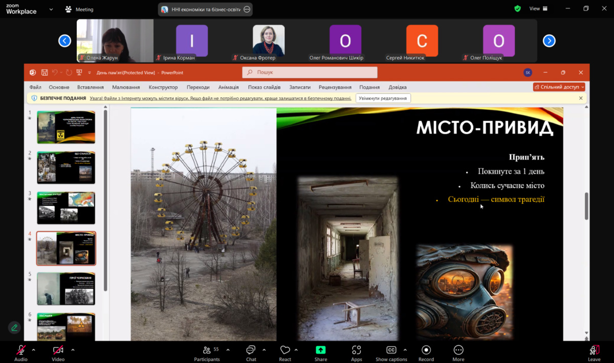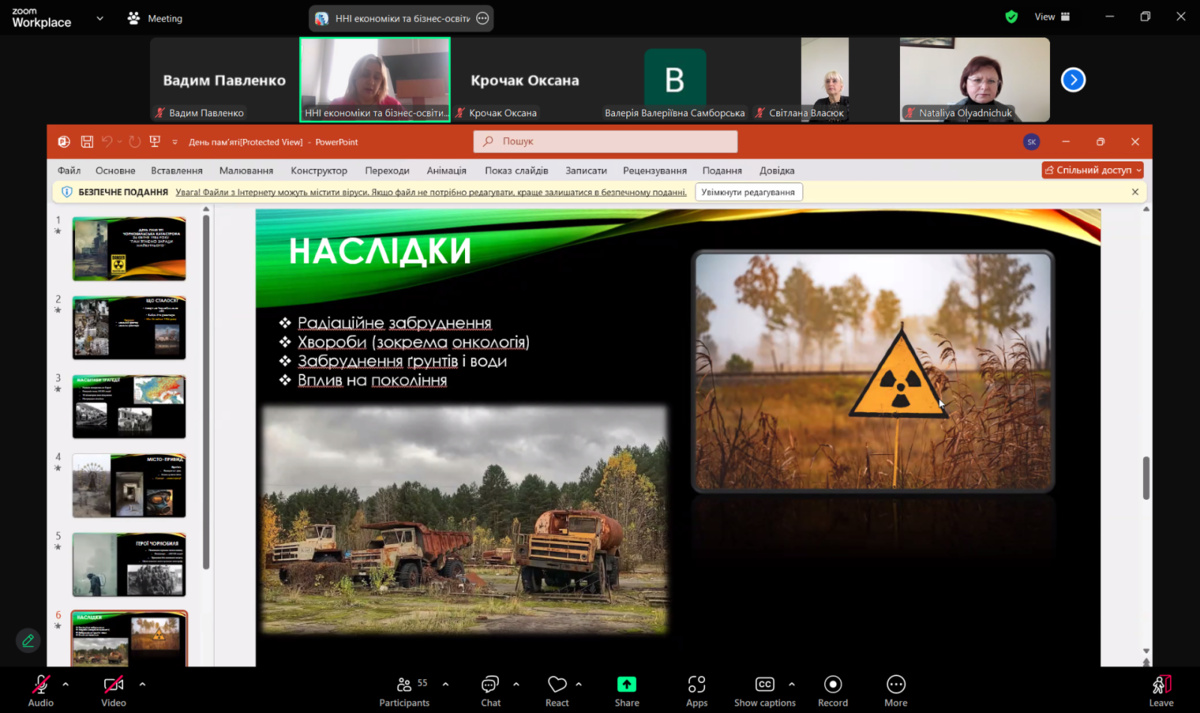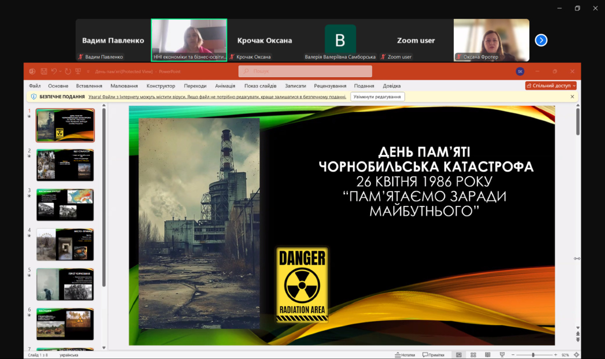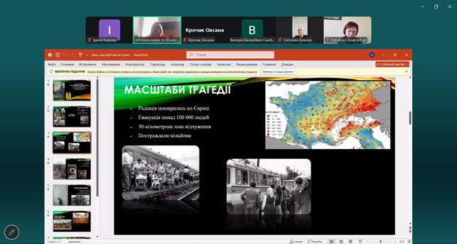24 квітня доцентка кафедри фінансів, банківської справи та страхування Наталія ОСАДЧУК провела виховну годину до 40-річчя Чорнобильської катастрофи для студентів факультету економіки, підприємництва та інформаційних технологій.