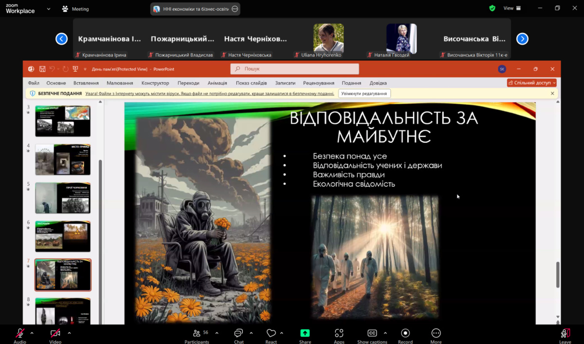 Під час виховної години учасники відзначили героїзм ліквідаторів і пожежників, які першими стали на боротьбу з наслідками аварії, працюючи в надзвичайно небезпечних умовах. Окрему увагу доповідачка приділила наслідкам катастрофи – як для довкілля, так і для здоров’я людей, адже її вплив відчувається навіть через десятиліття.